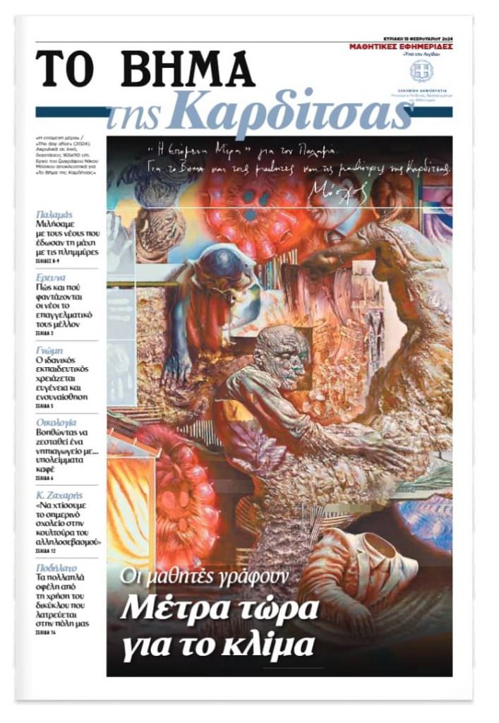 Just a few months ago, the prolific artist Nikos Moschos was invited to create the cover of To Vima’s student newspapers. That issue featured writings by students from Karditsa, a region still struggling with the devastation left by Storm Daniel.