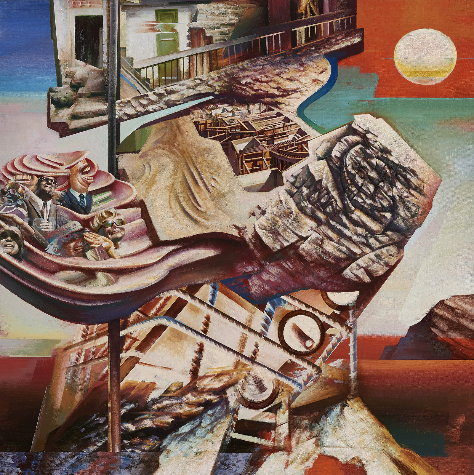 The changes and transformations seem to occur by themselves within the artwork. The individual parts appear to struggle for dominance over one another, like geological layers over time. Cause and effect coexist within the same image. The mixture of heterogeneous elements—such as rocks, machines, and a layer of whipped cream—serves as a kind of commentary on cultural evolution and the ongoing relationship of survival and organization within the environment.